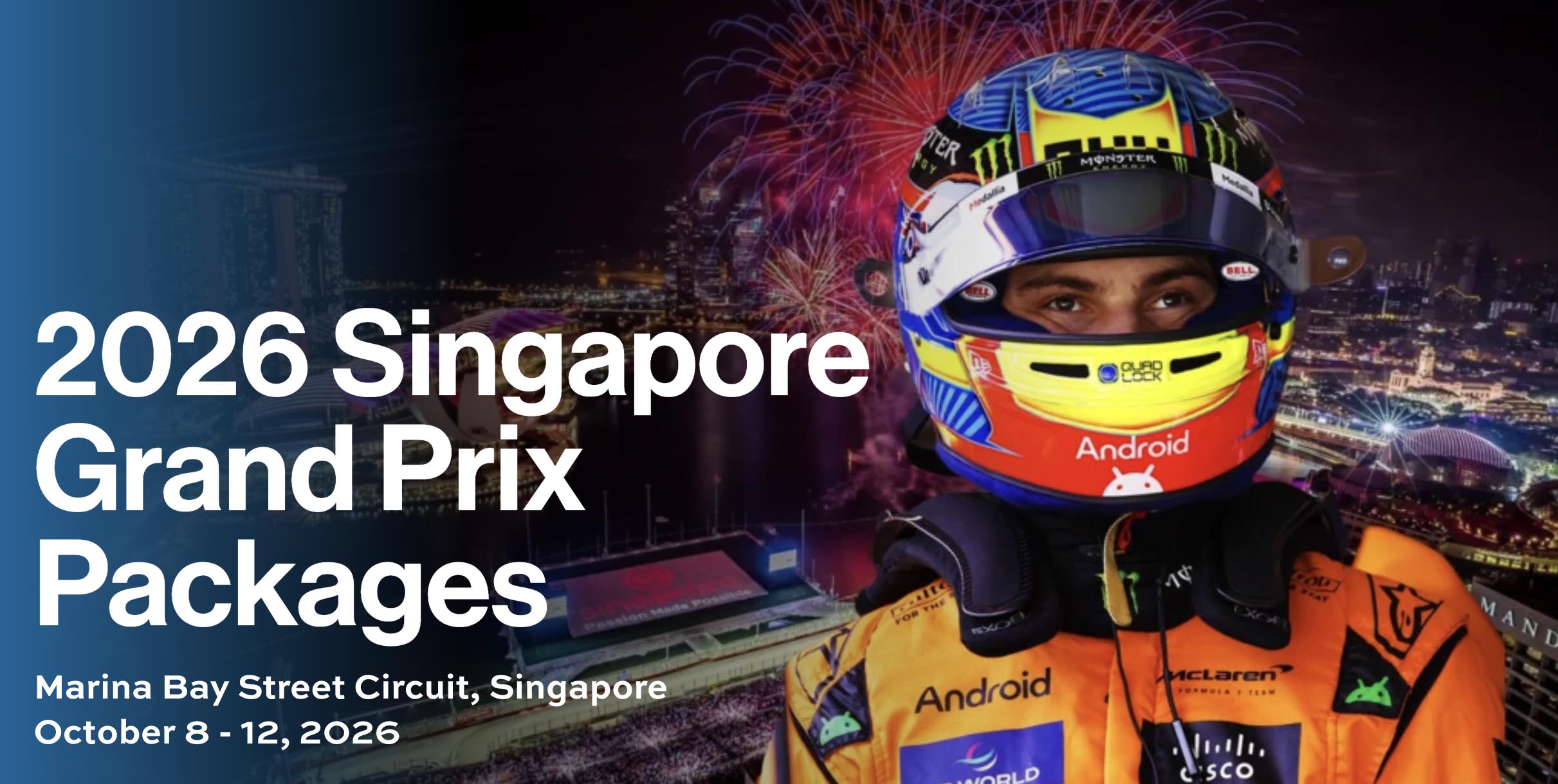 Allow us to take care of all the details so you can relax and immerse yourself in the excitement and glamour of the 2026 Singapore Grand Prix. Complete travel packages available from $8,550 (premium grandstand seating) or $17,415 (exclusive hospitality) per person, based on double occupancy.